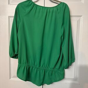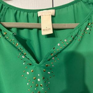 Add a touch of elegance to your wardrobe with this Chicos Size 1 Kelly Green Blouse. Featuring a flattering V-neck and 3/4 balloon sleeves, this peasant-style top is decorated with gold and silver embellishments, making it perfect for both casual outings and special occasions.