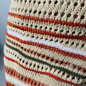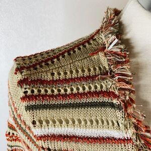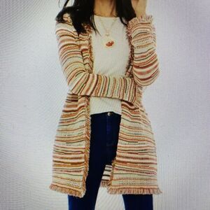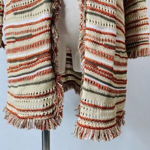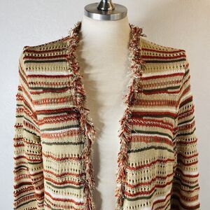 Chico's Sz 1 / Medium Petite Crochet Knit Zig Zag Cardigan Sweater Fringe Trim Long Line