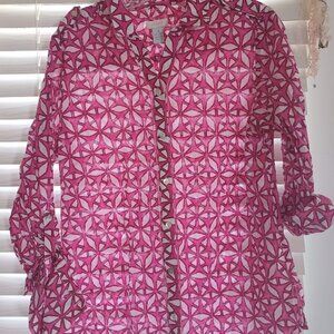 Stylish Chico’s button-front blouse featuring a pink and white geometric pattern.