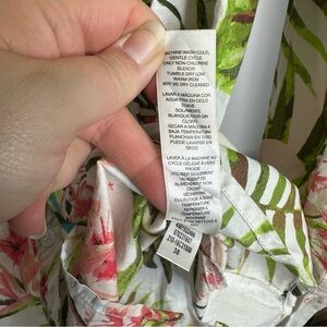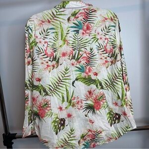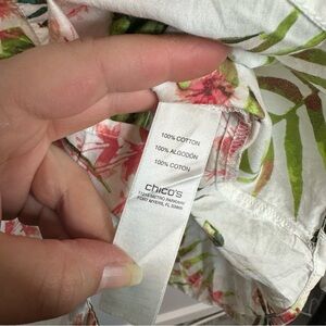 Chico's blouse with vibrant tropical floral design. Features pink flowers and lush green leaves on a white background. Ideal for a fresh, lively look.