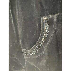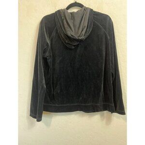 This Chicos Sz 1 (US M US 8) Women's Black Velour Sweatshirt with Sequin Details is a stylish and cozy addition to your wardrobe. It features a hoodie and pockets for added comfort and functionality.