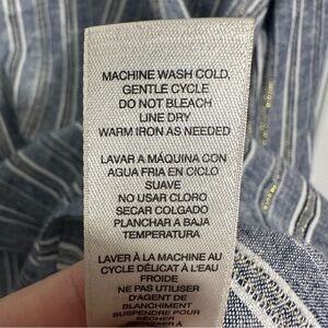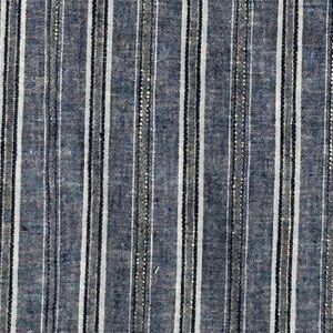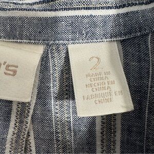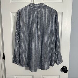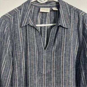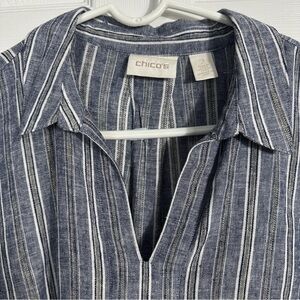 Chico's size 2 (large) tunic, 55% linen/44% rayon/1% other. Blue with vertical black/white/metallic stripes. V neck with collar, long sleeves. This would look great with jeans or leggings!