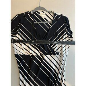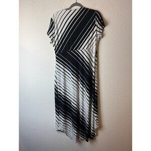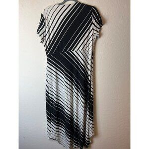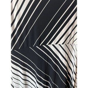 Chic Chicos Sz 2 (US 12) maxi dress with an elegant white and black bias striped pattern. Featuring a flattering faux wrap style, it's perfect for any occasion.