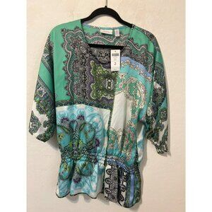 Experience a blend of comfort and style with Chico's Size 2 (US L 12) pullover blouse. It features a beautiful print in shades of green, silky material, and a cinched waist for a flattering silhouette.