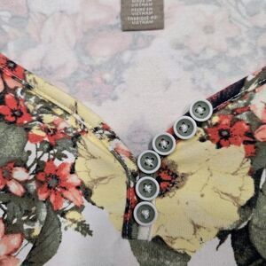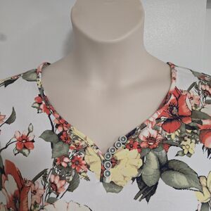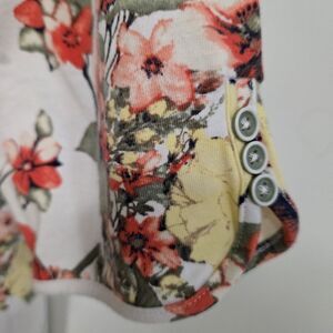 Very pretty tunic top in a multicolor bold floral print featuring coral, olive green and pale yellow. The button detail on the sweetheart neckline and the cuff gives this top a nice lift. See this same top in my store in Navy blue too. The overall condition is very good and shows light wear. See pictures for details. Don't forget to check my store before your checkout. Since I am recently working from home I have LOTS more merchandise posted in my store than usual. Don't miss this opportunity for more deals! Plus I ship next business day.