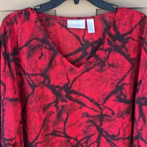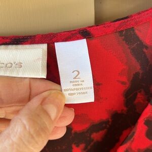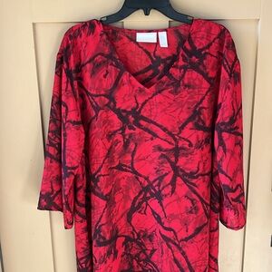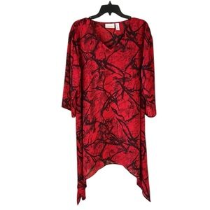 Chico’s SzL Red Black Long Line Sheer Chiffon Tunic Top Sharkbite Hem 3/4 Sleeve