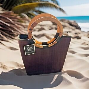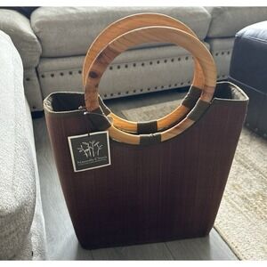 Chicos Tambo Large Handmade Woven Bamboo & Raw Silk Tote Bag Brown Wooden Handle