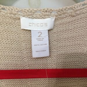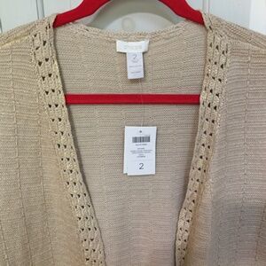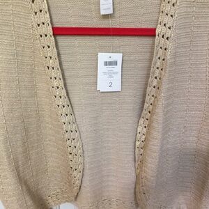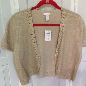 NWT Chico’s stylish open-front shrug with gold metallic detail, short sleeves, and delicate knit design. Perfect for layering.