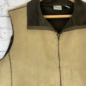 EUC Chicos tan suede vest, Chicos size 3. Pit to pit is 23. This vest is tan with brown seaming. The material is a poly blend material with paisley embossing which creates a great boho look. The inside is lined with a warm and soft silky fleece material. Great item for Fall layering.