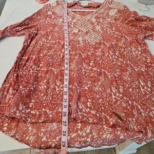 This elegant floral tan rust colored embroidered blouse from Chico's is crafted from 100% rayon, offering both comfort and style. Ideal for a refined look.
