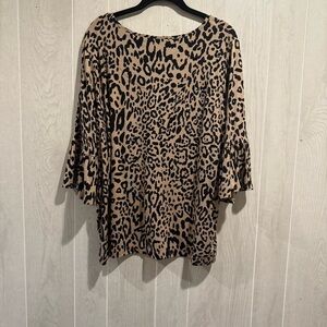 Chico's blouse with bold leopard print. Features flared sleeves. Ideal for casual wear.
