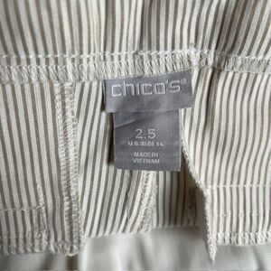 Chico's Tan and White Pinstripe Stretch Capris with Tummy Control Size 14 (2.5) Excellent condition. super stretchy, cute leg slit and button embellishments. See photos for details and measurements. Shop my closet to combine and bundle other items for one shipping charge! vacation, cruise wear, summer, spring, fall, neutral, khaki and white, beige and white,