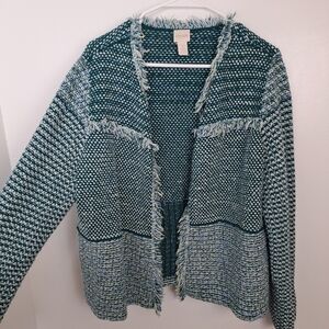 Chico's Teal Knit Tweed Fringe Business Casual Structured Cardigan Size Medium