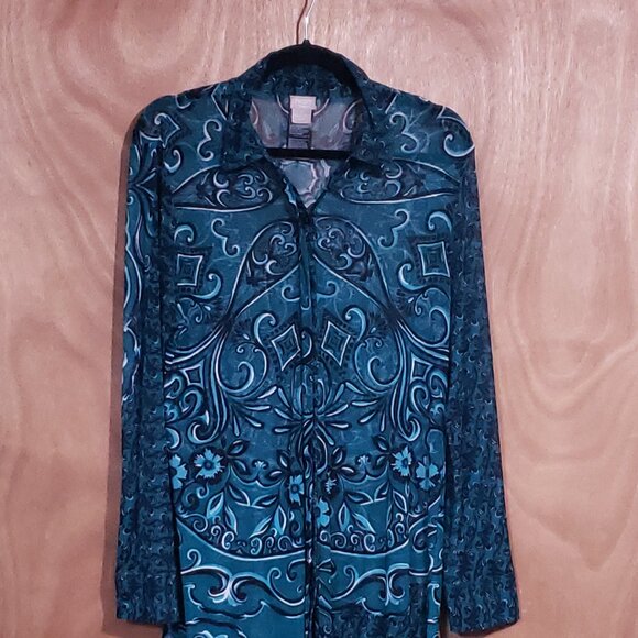 Vintage & looks like new. Very nice Chico's duster. It says it's a size 8-10, which is hard to see in the photo.