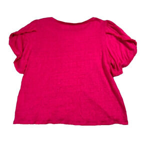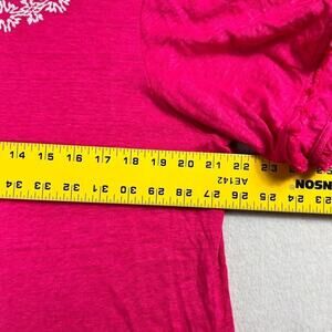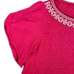 Chicos Tee Womens 3 US XL Pink Linen Knit Top Short Sleeve Pullover Embroidery Frayed Cuffs