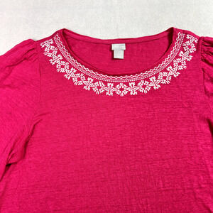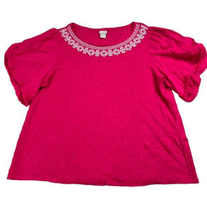 Chicos Tee Womens 3 US XL Pink Linen Knit Top Short Sleeve Pullover Embroidery