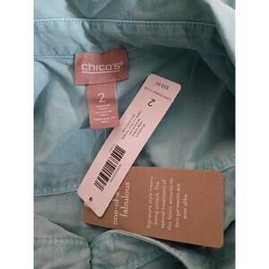 Chico's Tencel Aqua Reef Blue OOAK Dyed Long Sleeve Utility Shirt Vanity Size 2, in excellent pre-owned condition: no wear, still has original store tags, has not been recently cleaned, may be stale from storage. Marked as a women's vanity size 2, which is a women's US size Large/12, measurements are taken while laying flat and are approximate: (see photos)