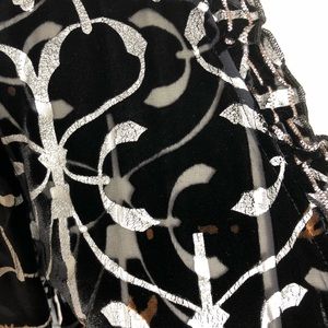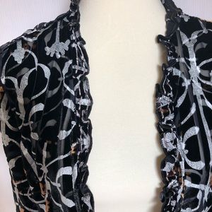 The darker parts of it are velvety and the very light parts are sheer. Ruffled neckline. Beautifully crafted. Never used so in excellent condition.