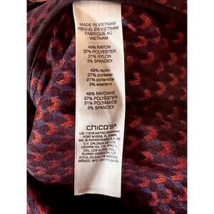 Chico’s textured knit jacket in a rich berry-red and purple geometric pattern. Soft, medium-weight stretch fabric with a clean open-front design and subtle cuff detail. Great elevated casual piece for work, dinner, or travel. No holes or stains noted. **Matching pants also listed in a size 1.5