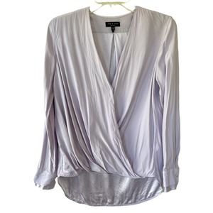 Excellent condition no flaws. No fabric content tag. Feels smooth like satin. Product Details STYLE: 570339998 You'll love the satiny-soft hand feel of our Textured Tie-Front Top. This modern black and white print is given a sassy twist with drama sleeves and a fun tie-front design. Make this silky top layer part of your party wear collection paired with your favorite pants. Made from lightweight fabric. Classic fit long sleeve V-neck top with tie front. 100% polyester. Machine wash. AP-5222