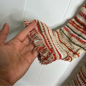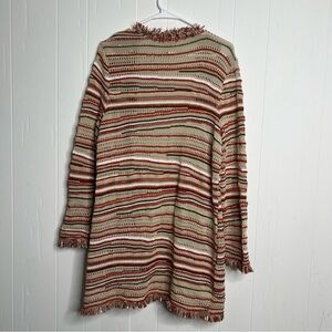 This cozy fringed cardigan works a chic new angle in a zigzag array of stripes with flashes of metallic knit detail.