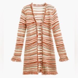 Chicos Textured Zigzag Open Front Longline Cardigan Fringe Metallic Detail