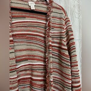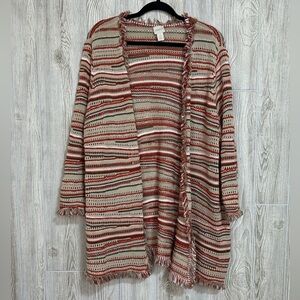 Chicos Textured Zigzag Open Front Longline Cardigan Fringe Metallic Detail XL