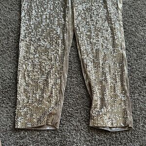 these have an elastic waistband. The back is entirely crushed velvet, and the front is entirely sequins. They are new with tag they are a size medium. They are like a tan cream metallic color.