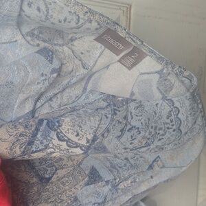 The Grey Patterned top has a veed neckline,3/4 sleeves, and is made from Chico's 95%Polyester, 5%Spandex" Geometric floral" print pattern fabric that almost has a slight shimmer to it.Bodice:39",Sleeve:17",Length: