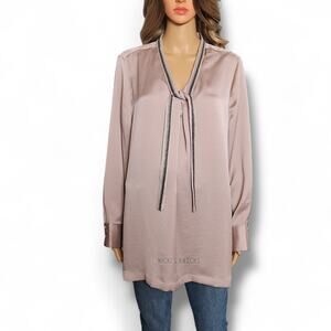 Chicos Tie Neck Satin Blouse Mountain Stone Taupe Champagne Size 2 Large