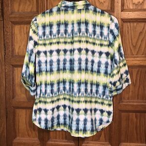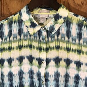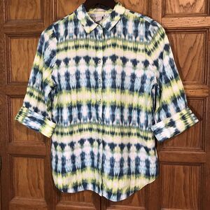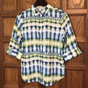 Chico's Tie-Dye No Iron 100% Linen Blouse Women's 4 Blue/Green Button Up Top