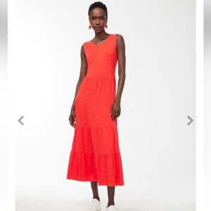 Chico’s Tiered Sleeveless Cotton Slub Red Maxi Dress. Pretty and comfortable. Such a cute everyday dress. Layer and accessorize for variety of looks. Tiered tank t-shirt design. Flowy and soft. Classic fit, sleeveless, scoop neck, pullover, maxi length, A-line. 60% cotton, 40% modal. Machine wash. red with orange undertones. Gently preowned in great condition.