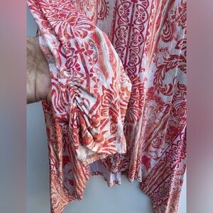 Orange, pink, and cream striped floral tribal print tunic top. Quarter sleeve with ruched cuffs. Handkerchief hem. Stretchy, soft, lightweight, curved neck. Casual, vibrant. Tropical.