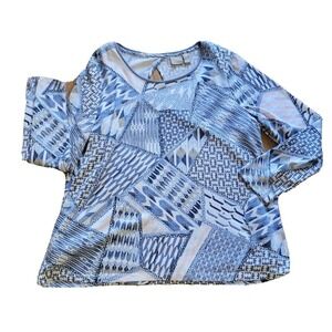 Chicos Top 3 Womens XL Blue Patchwork Print Open Back Sheer Casual Long Sleeve