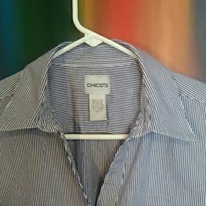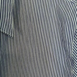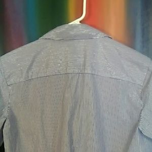 Blue/white/silver pinstriped long sleeve button down top. Food over collar, clear buttons. Double buttons at cuff. Size 1, (Medium) Made in China, 68% Cotton, 25 % Spandex & 4% "other fiber". Great condition, no stains/ holes/ missing buttons.