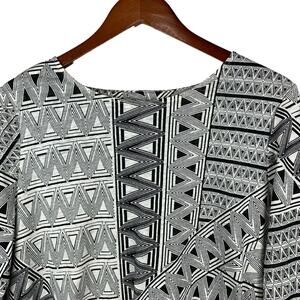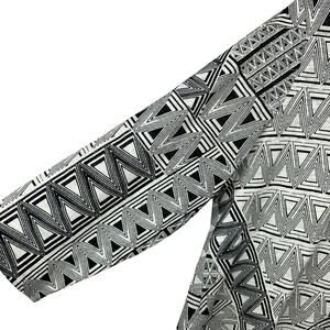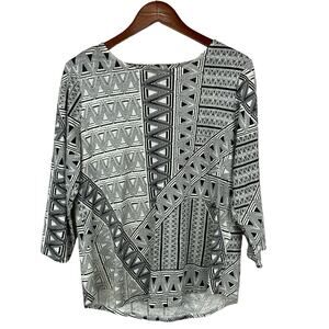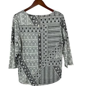 Chico’s geometric print top in women’s size 1 or medium 8. 100% linen knit fabric. Hand wash. 3/4 length sleeves. Decorative buttons on the back. Black and cream/beige pattern. Light wear to the edges of a couple of the buttons. Otherwise, excellent condition!