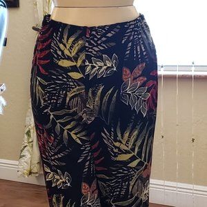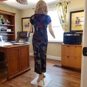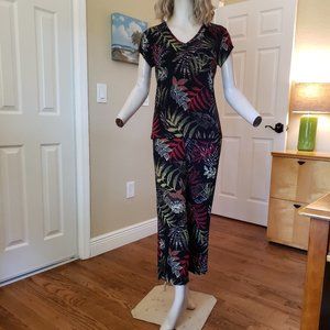 Chico's short-sleeved, v-neck pullover top with matching elastic waist crop pants. Tropical palm print in olive green, white, and coral colors on a black background. Both pieces are size 1 (ladies 6 - 8). Slinky, stretchy, crease-resistant, machine washable poly-spandex knit. Excellent condition.