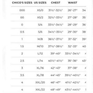 Chico's Size 3 - per size chart fits X-large / 16. For a slightly more relaxed, fits well on sizes chico's sizes 2 / 2.5 (large)