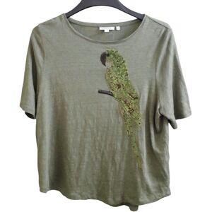 Chico's Top Sequin Parrot 100% Linen Beachy Tropical Olive Green Size 3 (XL)
