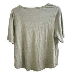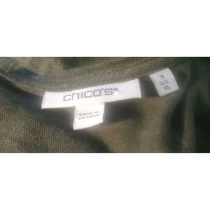 The Chico's Top Sequin Parrot 100% Linen Beachy Tropical Olive Green Size 3 (XL) is a stylish and vibrant blouse perfect for casual occasions. This top features a scoop neckline, short sleeves, and a pullover closure for easy wear. The garment is made of breathable linen material with sequin accents, giving it a touch of glamour. The tropical bird theme adds a fun and playful element to the outfit, making it a versatile addition to any woman's wardrobe. Hand wash only to maintain its quality.