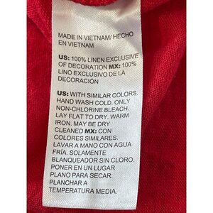 This Chico's women's blouse features a relaxed fit with a lightweight linen fabric. The vibrant red color and gold trim enhance its elegance, while the V-neck design adds sophistication.