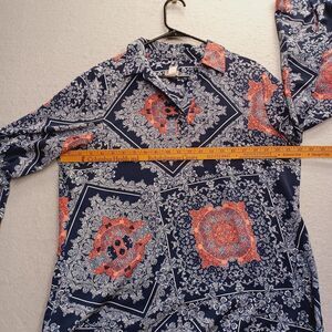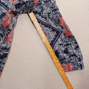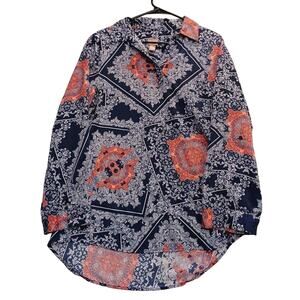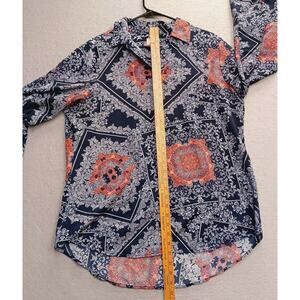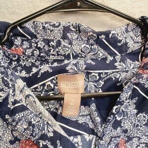 Chicos Top Womans 2 Lg Blue Floral Roll Tab Sleeve V Neck Pullover Blouse Boho