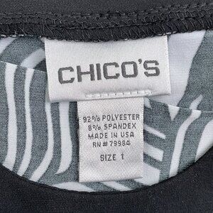 Chico's women's tunic top in size 1 Medium 8. Features a black and white geometric pattern with a flattering flare cut and scoop neckline. Made in the USA and designed to stretch for maximum comfort.