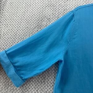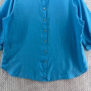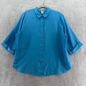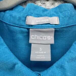 Chicos Top Women 3 US16 Blue Linen Non Iron Button Front Collared 3/4 Sleeve