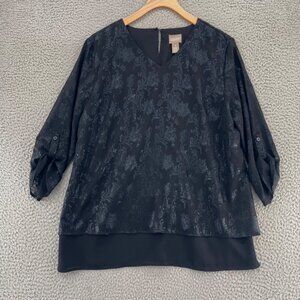 Chicos Top Womens 1 US Medium Black Shimmer Jacquard Layered 3/4 Roll Tab Sleeve