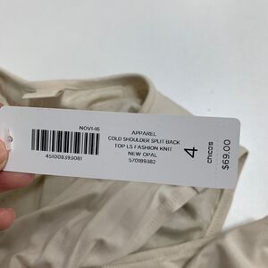 CHICOS TOP WOMENS 4 BEIGE TUNIC COLD SHOULDER SPLIT BACK GOLD DOTS CONTRAST HEM