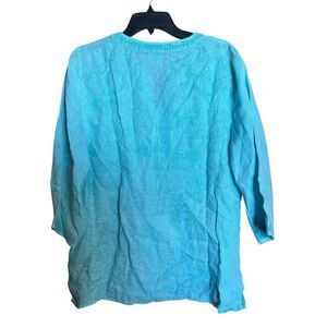 Elevate your wardrobe with this stunning Chico's blouse. The blue linen material is beautifully embellished, and the split neck design adds a touch of elegance. This blouse is perfect for any occasion and pairs well with any bottom. It is a women's medium size and has a regular fit. The blouse is categorized under tops, women's clothing, women, and clothing, shoes & accessories. Get ready to turn heads with this must-have addition to your wardrobe.