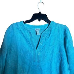 Chicos Top Womens Medium Blue Embellished Split Neck Linen Popover Blouse