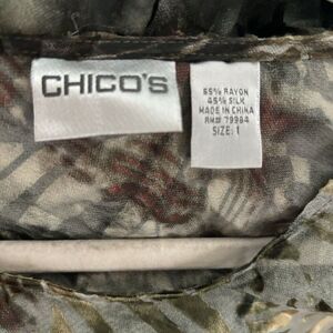 Elevate your wardrobe with this stunning Chico's blouse. The multicolor abstract print on this silk blend sheer blouse is sure to turn heads. Perfect for any occasion, this blouse is made for women who want to make a statement. The blouse is available in a regular size medium and is ideal for those who want to add a touch of elegance to their outfit. Made with high-quality materials, this blouse is designed to last and provide comfort all day long.