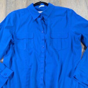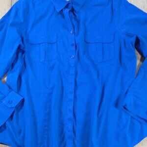 Chicos Top Womens XL Blue No Iron Button Up Roll Tab Sleeve Pockets Preppy